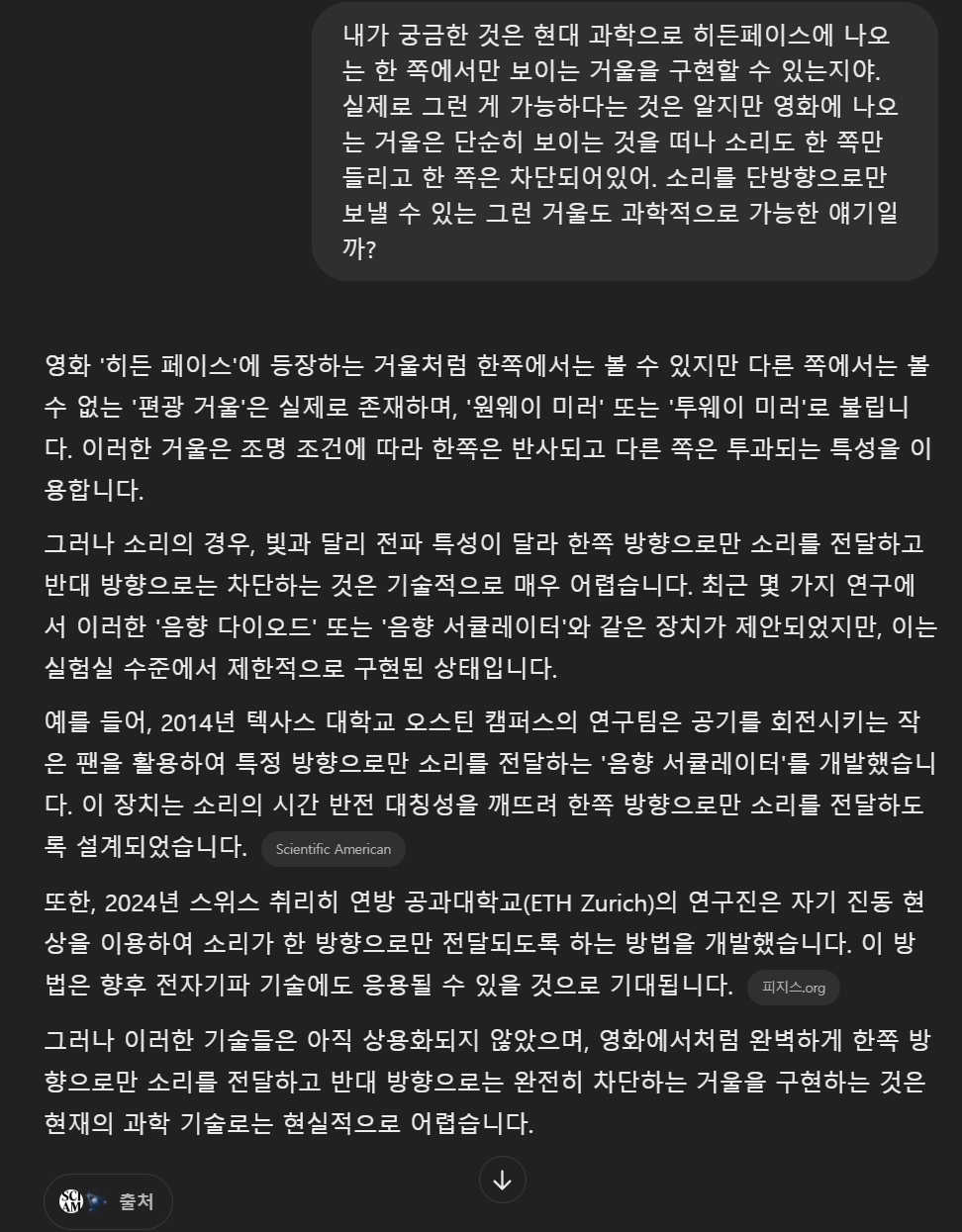 ㅋㅋㅋ 뭐 이 얘기가 중요한 건 아닌데, 보면서 이런 생각을 한 걸 보면 나도 참 이상하다는 생각. 어딘가에서 소리를 제어하는 것이 불가능하진 않지만 너무 위험해서 금지하고 있다는 이야기를 들은 적이 있는데 실제로 그럴 것 같기도 하다. 소음기가 달린 총 정도면 애초에 총이 가진 위험이 크다고 느낄 수 있겠지만, 아예 소리를 안들리게 하는 무언가로 큰 위험을 일으키는 것은 정말 쉽기 때문이다. 그래서 그런 기술이 나와도 대중적으로 상용화되기는 어렵지 않을까 싶기도 한다.